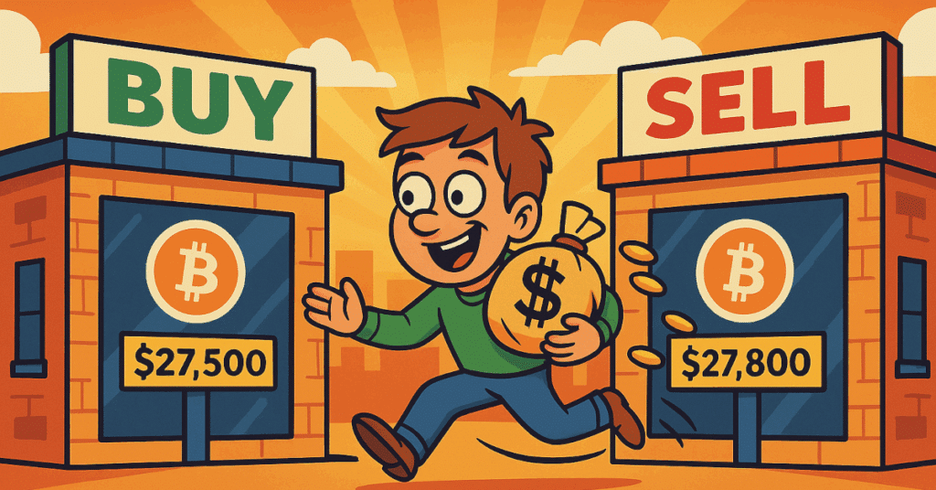 In simple terms, arbitrage trading in crypto means buying a coin on one exchange where it’s priced lower and selling it on another exchange where it’s priced higher. The profit comes from the price difference between exchanges.