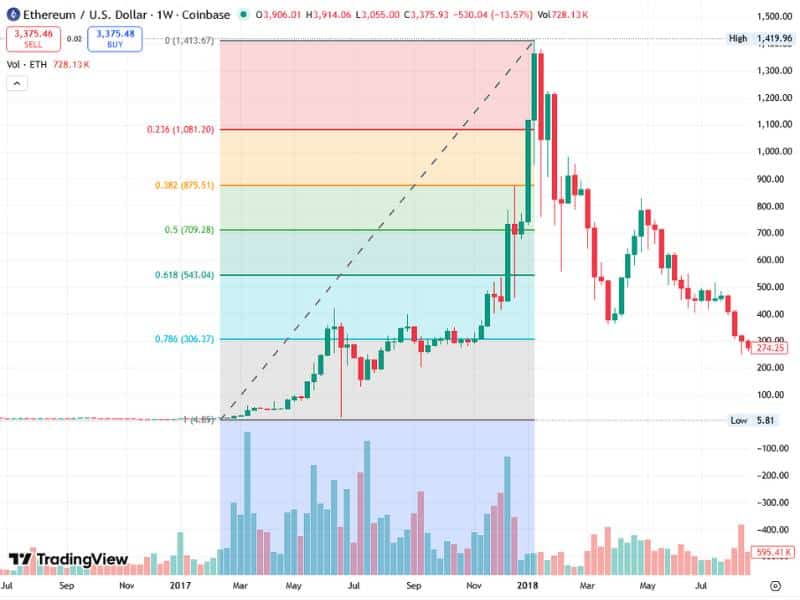 These levels can show where the price might stop, reverse, or shoot up. The "golden pocket", between the 0.618 and 0.786 Fibonacci levels, has appeared in every big Ethereum cycle.